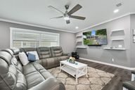 Breakfast bar center islandFront lanaiCorner windowSliding glass windowsQuartz countertopsCeiling fansStack washer and dryer