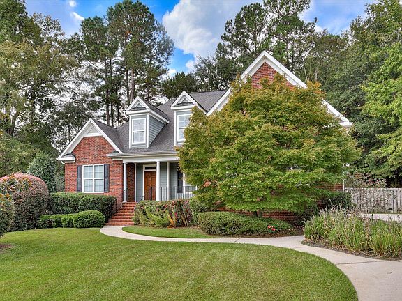 PRICED TO SELL!! Welcome to your dream home in Sumter Landing! This stunning 4-bedroom, 3.5 bath brick residence is perfectly situated on a picturesque 1-acre cul-de-sac lot. The exterior features a generous driveway with parking pad, an attached oversized garage as well as covered front and rear porches. Enjoy the spacious rear patio and privacy fencing for sunning and outdoor relaxation. Inside, the main level boasts a spacious owner's suite with a luxurious en-suite bathroom, complete with jetted tub, tiled shower, and double vanity. The inviting living room is enhanced by a cozy gas log fireplace and soaring vaulted ceilings. The kitchen is great for cooking and entertaining, featuring custom cabinets, granite countertops, and hardwood flooring that extends into the breakfast nook and formal dining room. Upstairs, you'll find three bedrooms, two full bathrooms, and two versatile flex rooms—one perfect for an office, study, craft room, or media room, and the other ideal for a guest or game room with a wet bar. Ample storage is available with multiple attic access points. This home is conveniently located near Columbia County schools, and the community amenities offer a swimming pool, playground, sidewalks, and a nature trail leading to a dock on the Savannah River. Don't miss your chance to make this stunning home your own!