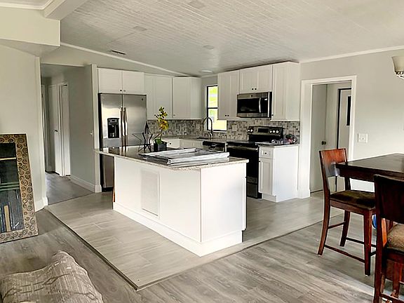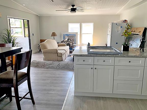 JUST COMPLETED FOR YOU!!! Here you have a spacious 2 bed/ 2 bath home that has just been completely redone. You enter the home through a front sunroom that can be a Florida room or lanai when you open the windows. Proceed through French doors to the open living/dining and kitchen area which have all been remodeled. The custom kitchen has beautiful granite and a large island. There are two good sized bedrooms with all new custom bathrooms. The surprise is the large screened lanai just off the kitchen. The home is furnished has a garage and is located on our lowest lot rent.