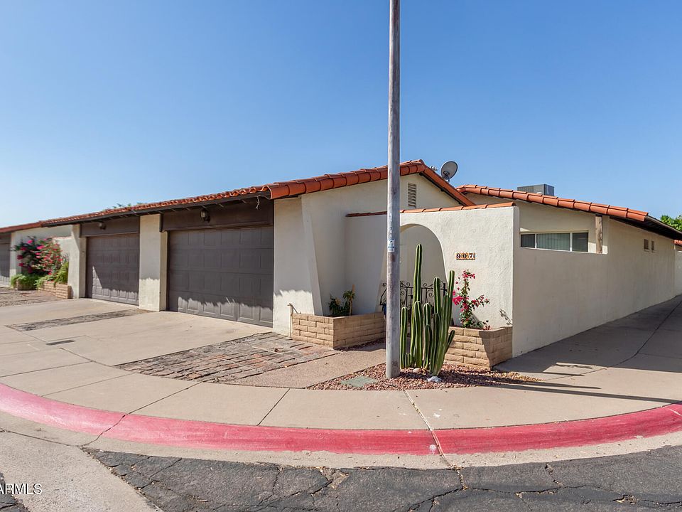 LOCATION, LOCATION, LOCATION! This 3-bedroom, 2-bathroom home features an inviting floor plan perfect for everyday living. The great room, adorned with Saltillo tiles, creates a warm and welcoming atmosphere. Step outside to your private courtyard, an ideal spot for morning coffee or evening gatherings. Enjoy a peaceful retreat in your own back yard. Located on a desirable corner lot, this home offers both privacy and convenience. Enjoy access to a large clubhouse and sparkling pool, perfect for socializing and relaxing on sunny days. With a prime central location close to shopping, dining, and recreational activities, everything you need is just minutes away.