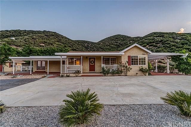 Looking for a home that offers peaceful tranquility and amazing views from EVERY room? Well look no further! This charming single story ranch home in Leona Valley is situated on over 4 acres of property and has breathtaking views both inside & out. Inside you will find an open floor plan with a nice sized living/dining room complete with hardwood floors, a beautiful kitchen with white cabinets and ample counter space open to an eat in dinette area, 2 spacious bedrooms, 2 full bathrooms & a private laundry room. Outside you can enjoy not 1, but 2 separate patio areas watching the sunrise/sunset while overlooking majestic mountain views. There is also a detached garage that has been converted into a bonus space that could be additional storage or a great hang out area. The acreage offers great potential with sections of flat usable land. You will never feel like you need to take a vacation when you have views like this! Come check it out for yourself. You won't be disappointed!