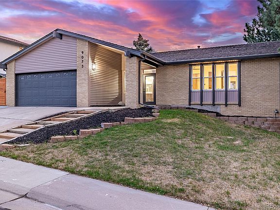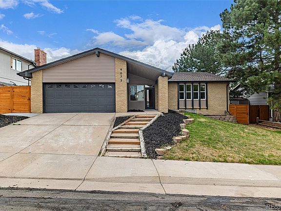 Step through the inviting entryway into an expansive open-concept living space designed for everyday living and entertaining. The heart of the home is the beautifully updated kitchen, with sleek cabinetry, quartz countertops, stainless steel appliances, a spacious center island, and designer pendant lighting. The adjoining dining and living boast new luxury flooring, recessed lighting, and a floor to ceiling brick fireplace that anchors the room with warmth and character. Large windows and dual patio doors flood the space with natural light and provide seamless access to the brand new deck overlooking the private backyard. From here, enjoy peaceful evenings with views of the mountains and Colorado sunsets.