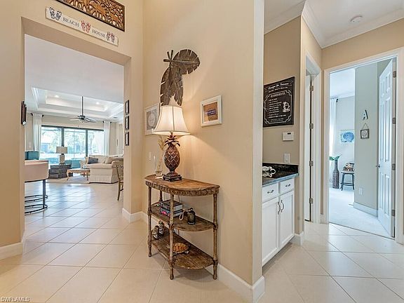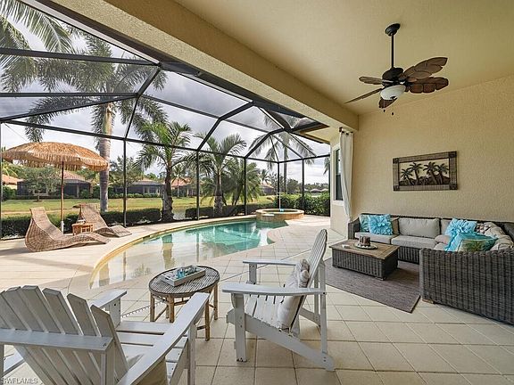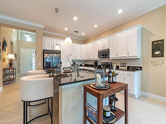 Decorator upgrades recently added throughout this beautiful lakefront single family pool/spa home in Bonita Isles! Best selling Salerno floor plan with 3 bedrooms, 2.5 baths, and 2 car garage. Impact double pane windows and doors throughout. This home features an open Great Room joining the kitchen, dining, and living areas. Large kitchen island and plenty of cabinet space provide a perfect space for the chef in the family, or for entertaining. Kitchen highlights include white cabinets, 42 inch upper cabinets with crown molding, custom backsplash, and newer appliances. Great room features high, 2 step tray ceilings, and 3 panel sliding glass doors leading out to the spacious L-shaped lanai. Custom designed pool with sun shelf, spa with overflow, and lots of deck space. Large bay windows in master bedroom allow bright natural light. Guest bedroom has private attached bath offering privacy for family and guests. White cabinets in bathrooms. Generous laundry room with sink, and upper cabinets for storage. Just a short walk to the Bonita Isles amenities - including Clubhouse, fitness center, resort style pool, tennis, pickleball, and kid’s play area. Sidewalks on both sides of the street are perfect for an evening stroll, or morning exercise. Reasonable fees and no CDD! Located near Coconut Point Mall, Bonita Beach, and numerous shopping and dining options. Bonita Isles residents enjoy a very busy social calendar with First Fridays, holiday parties, movie/dinner groups, card groups, sport groups, and more!