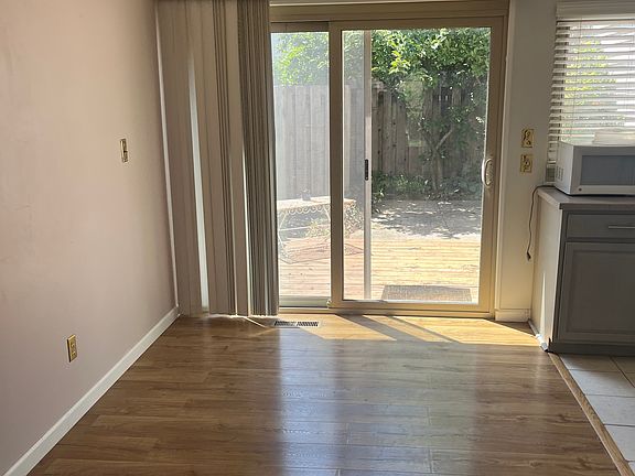 Private rear patioHalf bathOpen-concept layoutSliding glass doorsTile flooringWood flooringStorage space