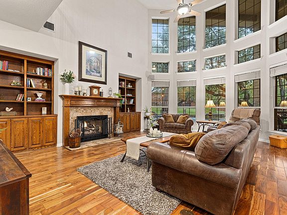 Rare opportunity on one of the largest lots in Forest Creek — over half an acre (.534) tucked at the end of a quiet cul-de-sac with a 3-car garage. Backyard retreat features a 24,175-gallon inground pool with sundeck, 7.5’ deep end, hot tub, and outdoor kitchen with granite counters, built-in grill, cooler, and bar seating. Over 20 mature oak trees provide natural shade and privacy. Interior highlights include Acacia hardwood floors in the living and primary, engineered wood in the formal dining and office/formal living. Two bedrooms downstairs including a large primary suite with bay window, crown molding, and updated bath featuring granite double vanity, frameless shower with seat and dual heads, and jetted tub. Family room features soaring 19’ ceilings, gas fireplace, and integrated audio/video wiring. Oversized kitchen with gas cooktop, double ovens, stainless appliances, ice maker, butler’s pantry, bar seating, and desk area. Upstairs offers three large bedrooms with Jack-and-Jill bath, a spacious game room with built-in speakers, and a second flex/game room that can function as a 6th bedroom. Upgrades include roof (2022), full exterior paint (2022), full house seamless gutter with stainless steel gutter guards, water softener with Carbo filtration, solar window film on back windows, and Google Fiber. Oversized 3-car garage expanded by 6’, insulated, with high ceilings and pulley storage systems. Forest Creek HOA includes community pools, tennis courts, and playgrounds. Minutes to Forest Creek Elementary, Ridgeview MS, and Cedar Ridge HS. Convenient to Kalahari Resort, Dell Diamond, Old Settlers Park, H-E-B, and Forest Creek Golf Club. Easy access to SH-45 and 130 and the airport and close to Apple, Dell, Samsung, Tesla, and Emerson. Buyer to verify all information.