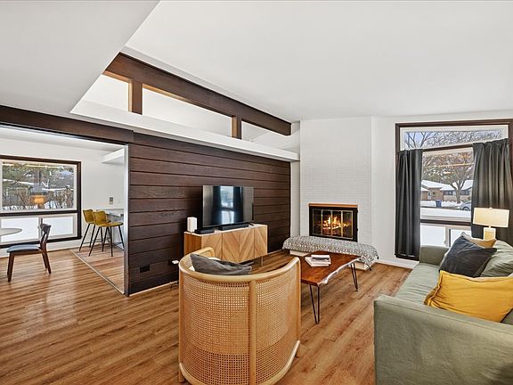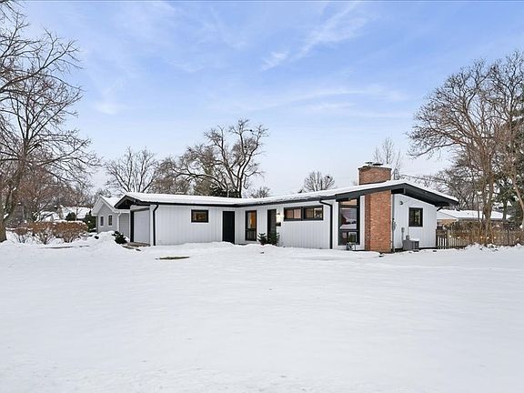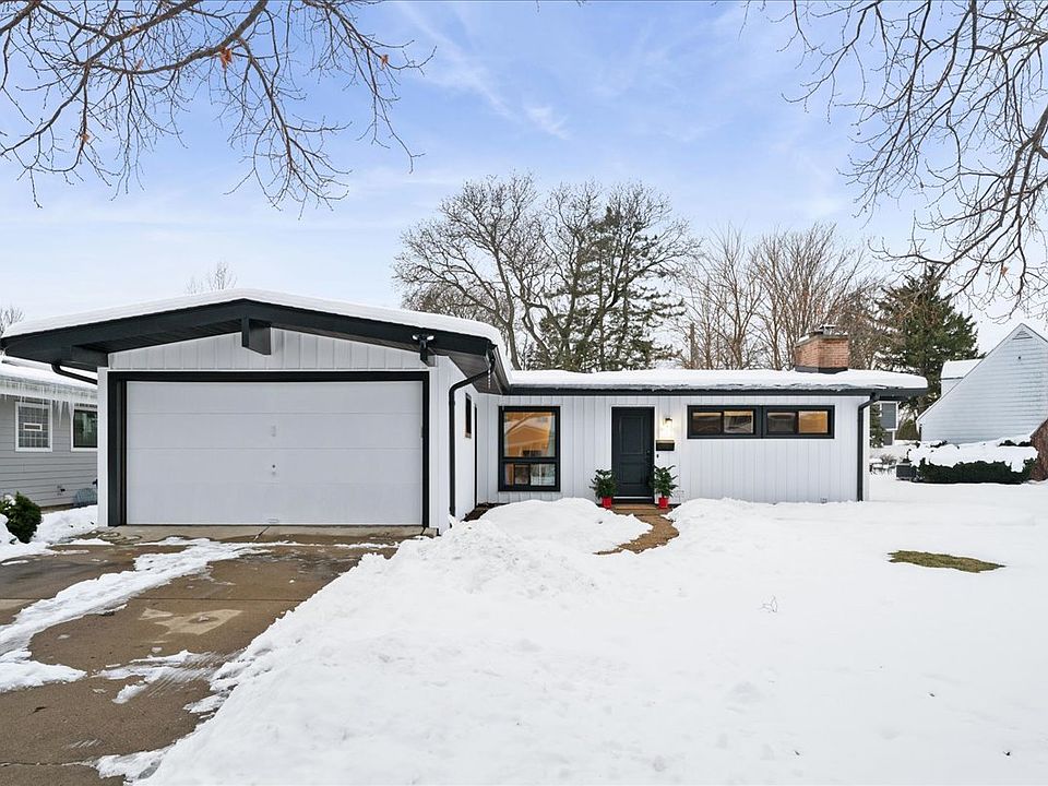 Updated Mid-Century Modern home with so many updates you won't believe it! The design of this 3 bedroom ranch home captivates you with its' timeless style. The vaulted ceilings, exposed beams & walls, wood accent wall and sliding screen door all define mid-century modern design! The front entry opens up into the inviting living room with a brick fireplace to enjoy cozy evenings. The living room flows seamlessly into the kitchen/dining combo that has been updated with stylish cabinetry, gas cooktop, and new sink and Kohler faucet. The refrigerator and dishwasher(1/2024) have been replaced for your ease and convenience. You'll enjoy the view to the backyard with a fence, patio and a new exterior door to access the space. Check out the main floor bathroom that was rehabbed in 2023 with a stylish walk-in shower with white subway tile and a geometric floor tile, new vanity and Kohler bath fixtures. Next you'll find the primary bedroom with an updated half bath with cool navy and white tile with a new vanity, fixtures, and toilet!! The exterior of the home has been redone with classic white siding, new fascia, soffits, gutters and a new roof installed in 2023!! Also, new windows were replaced throughout the home. New exterior doors have been installed on the front, back, and garage and add to the home's curb appeal. A full unfinished basement has been waterproofed with a transferrable warranty, a sump pump with a backup battery has been installed and the electrical panel has been upgraded. You can almost double the size of this home when you design your dream basement! This home is move in ready and waiting for you to move in and start living your best life!!
