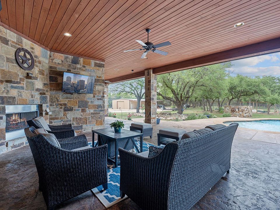 Stunning 4,043 sq ft single story custom home on 5 private acres in Georgetown, with an optional additional 8-acre tract available—perfect for maintaining a wildlife exemption. This thoughtfully designed 3 bedroom, 4 bath property has a separate game room with wet bar and a study that includes beautiful built-in cabinetry. Custom features throughout include whole-home foam insulation, stained concrete floors, wood floors in the master suite, and custom knotty alder doors and cabinetry. The spacious kitchen showcases a large island and an oversized gas cooktop, double ovens, and reverse osmosis system. Plantation shutters, remote control roller shades, and designer finishes add luxury touches throughout. Enjoy year-round entertaining with a massive covered patio (1,100+ sq ft), outdoor kitchen, fire pit, and gas fireplace, all overlooking the saltwater pool. The home is prewired for audio in the family room, outdoor patio, pool area, kitchen, and media room. Security and efficiency are top-notch with CCTV cameras, monitored alarm system, water softener, and two tankless propane water heaters. The oversized 2-car garage features epoxy floors and a storage/workshop area, and a long concrete drive with room to park 8+ vehicles. Bonus shop building includes bathroom, foam insulation, 3 roll-up doors, and RV electrical hookup. Additional highlights: chicken coop, raised garden beds with irrigation, automatic sprinkler system, and each guest bedroom has a private en-suite bath. No HOA allows for hassle free living in one of the most desirable areas in Georgetown.