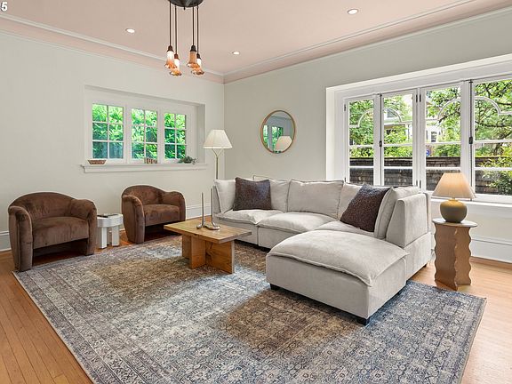 If you seek an elegant historic home with good bones to bring your own design ideas to life, this is the rare opportunity you have been looking for. Be sure to seize it - It's about a once in every 5-10 year possibility- don't miss out! ALL OFFERS WILL BE CONSIDERED. This classic 1908 Craftsman sits on a prominent corner lot in Northwest Portland, just blocks away from NW 23rd Avenue’s shops, restaurants, and amenities. Rich in original detail, the home features hardwood floors, wainscoting, beamed ceilings, picture rail molding, and endless charm. The main floor is designed for comfortable living and easy entertaining, with a grand entry, powder bath, and living room featuring a new gas fireplace and access to a wraparound porch. The formal dining room, accessible from both the entry and the kitchen through French doors, offers window seating and gorgeous detailing. The spacious kitchen, complete with a breakfast nook, opens to an expansive double patio. Mature landscaping offers both beauty and privacy. Upstairs are four spacious bedrooms, including a generous primary suite with a new gas fireplace. The second bedroom features built-ins. The third bedroom showcases wainscoting and a wood-burning fireplace, while the fourth bedroom is ideal for a home office, outfitted with original French doors to a private balcony with peekaboo views. The semi-finished attic provides a large bonus space with a gas stove—perfect for a game room or creative retreat. The basement includes laundry, a shower, and a RECENTLY ADDED COMMERCIAL SPACE with soundproofing, a separate entrance, waiting room, half bath, and air conditioning—ideal for a home business or client-facing setup.A private driveway, flexible layout, and unbeatable location make this a rare opportunity to own a true piece of Portland’s architectural history.