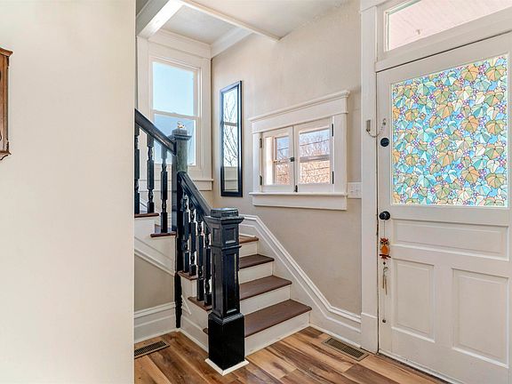 Nestled at the corner of Trout and Kinzley Streets, this home offers stunning views of Staunton and the Blue Ridge Mountains. This well-preserved historic home blends timeless charm with modern updates to create a warm, inviting retreat. Built in 1900, it retains its character while incorporating thoughtful improvements. A welcoming front porch and spacious rear deck provide ideal spaces to enjoy the surroundings, while a level backyard framed by stone retaining walls offers a private outdoor escape. The garden, filled with flowers, apple trees, and berry bushes, shines in spring and summer. Inside, large new windows fill the home with natural light, highlighting original mantles and built-ins. The updated kitchen features butcher block countertops, white cabinetry, and fresh flooring, balancing classic appeal with functionality. Upstairs, three bedrooms and a versatile extra room—ideal for an office, nursery, or walk-in closet—provide ample space. The consistently dry basement offers excellent storage. Meticulously maintained by the current owners, the home is equipped with central air, a heat pump, and energy-efficient windows. 908 Trout St is within walking distance of downtown shops, restaurants, a farmers market, and parks.