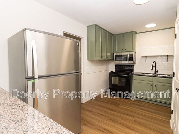 Step into the welcoming living room, which flows into the kitchen around the corner. The kitchen features beautiful green cabinets, an eat-up bar, a stainless steel refrigerator and microwave, a range, and a utility closet with washer and dryer hookups. A side door off the kitchen leads to the backyard, offering convenience and easy outdoor access.