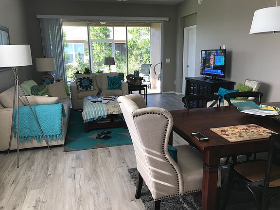 Beautiful Gray Mist Model 3/2/2 has been updated with the newly painted exterior & light plank laminate flooring in main living area, 1 guest room and guest bath. Retractable screen on front door and personal touches colorful tile in the master bath & custom wall paint through out. Eat in kitchen includes stainless steel appliances, 42'' cherry cabinetry with side cabinet and granite counter tops. Pendant lighting above sink, comfort height commodes & cabinets, rounded corners & screened in lanai. Outdoor maintenance includes mowing, edging, trimming, weeding, mulching, fertilizer & water for the irrigation system