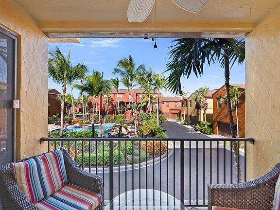The rarely available Santa Cruz model is the only home in Ole' that features a large front porch and a rear balcony with beautiful tropical views of the pool and palm trees! Relax on the front porch and enjoy the sunrise and unwind on your back balcony with your favorite beverage and enjoy the sunset hues! The townhouse is located on a beautiful, tropically landscaped Quad with an inviting neighborhood pool and pergola just outside your back door. Furnished turnkey and move-in ready. Three bedrooms, two full baths, and a powder room. Large two car garage with an extra refrigerator. New 30-year tile roof! The Ole' community features a Village Center with an 80-seat movie theater, state-of-the-art gym, Bistro & Pub, ice cream parlor, and a resort style pool and spa. Plus pickleball, tennis, basketball, bocce, sand volleyball and an active social calendar filled with fun events and activities. Just around the corner Lely Resort is home to three championship golf courses (two of which are public) and the amazing Players Club, offering optional memberships. Ideally located just minutes to Naples iconic 5th Avenue & Third Street with world-class restaurants, shopping and beaches. Or a short drive to the beautiful beaches of Marco Island and the fantastic island restaurants of Marco and Isles of Capri!