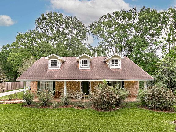 This custom home on 1.05 acres between Baker and Central has many beautiful features including a spacious front porch, patio, exterior walls that are constructed 6" thick, insulated windows, vinyl siding on eave and facia, extra concrete parking, 3 car garage, large island in kitchen, granite counter tops, walk in closet in master bathroom, wood walls and wood vaulted ceiling in sun room. Pecky cypress walls and fireplace in den. Sunroom with vaulted wood ceiling.
