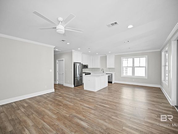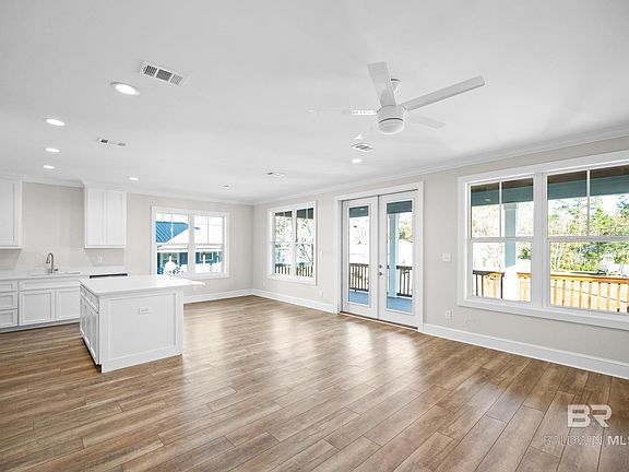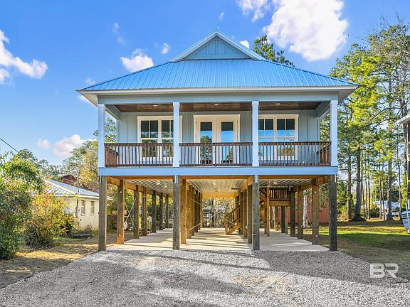 New Construction Bungalow in Miflin area now available! The blue hues of this coastal property mirror nearby Moccasin Bayou which is move-in ready and tastefully designed with concrete board siding, metal roof, stained wood porch ceilings and an abundance of usable space below with endless future potential for additional space and storage. The open porch takes full advantage of the breeze and is the ideal spot to relax and unwind. The interior boasts rustic LVP flooring, high ceilings, gorgeous light granite countertops and bright, white cabinets which round out the southern charm this property exudes. The open concept kitchen and living area include views overlooking the front porch, while the three bedrooms and two bathrooms are well appointed with the primary featuring a stunning double vanity and tiled walk-in shower. A short distance to the community boat launch rounds out this quaint property in Elberta, only minutes from Foley amenities. Don't miss this opporutnity to grab your piece of paradise along the Alabama Gulf Coast! Buyer to verify all information during due diligence.