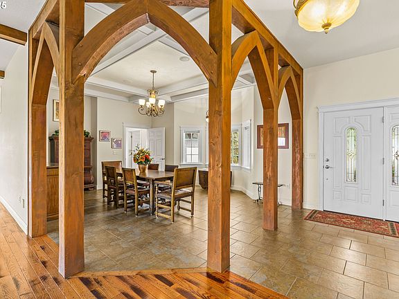 Come marvel at the magnificent views in this custom constructed Chalet/Tudor-style home. Nestled in Eugene's Coburg Hills, practically in the clouds, high above the busy world below, you'll witness glorious sunsets and inspiring city/night lights. This home is part of the Cloud Nine Ranch, a gated upscale neighborhood, w/ large parcels, private access, and a shared community well providing some of the tastiest water in the county. Perched on a level knoll, this home offers multi-generational living and a spacious floor plan along with several places to entertain, both inside and outside. Come see the contemporary interior design that gives an Old World feel with rich wood surfaces, tons of natural light, and high ceilings. Bring your biggest furniture, or maybe a piano!? Because you will have plenty of room for your dining table or sectional couch and lots of wall space to display your finest art. The layout consists of a gourmet kitchen, breakfast nook, family room, living room, formal dining room, primary suite with walk-in shower and walk-in closet, laundry #1, and a large additional bedroom with a bathroom and separate entrances-could be utilized by the guest suite upstairs as part of that separate area. Upstairs is a large bonus/family room w/ wet bar, 3 spacious bedrooms, two full bathrooms,bedroom 6 (maid's qtrs), and laundry #2 with a utility sink and storage. Above the finished 3 bay garage is the separate guest unit w/ kitchenette, bathroom, separate entrance, balcony, and access to the downstairs laundry #1 and bedroom #2 downstairs, if desired. Ample storage abounds throughout with many closets and built-ins. Stay warm or cool with the efficient forced air HVAC system or cozy up to the wood fireplace with a Heatilator fan. Outside you will benefit from plenty of parking and a large yard to run the kiddos or the pets. Fenced area in back for dog run & veg garden. Tons of wildlife and so much more to offer from this beautiful and unique masterpiece!