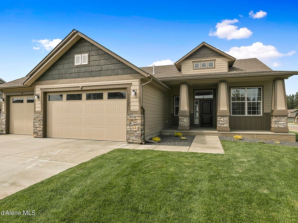 New Construction, You Design! New development with beautiful views of Rathdrum Mountain. This rancher floor plan features stone accents at the garage and columns at the large covered front porch with a grand entry open to dormer above. Home includes cathedral ceilings throughout the family room, dining and kitchen, double door entry to the office, a laundry/mudroom off the garage with rod and shelf closet, and a bonus room with door above the garage. Open floor concept from the family room, dining room and kitchen. Kitchen features 42'' upper cabinets with crown molding, a large island with an eating bar overhang, hard surface counters, stainless steel appliances, and a pantry with additional storage closet off the kitchen. Master suite features double walk-in closets with with one larger than the other. The spacious full bathroom includes double sinks with drop down makeup counter between, pocket door for privacy to the toilet, and a massive 5' x 6' mudset shower with tile to the ceiling, tiled bench, and glass door.