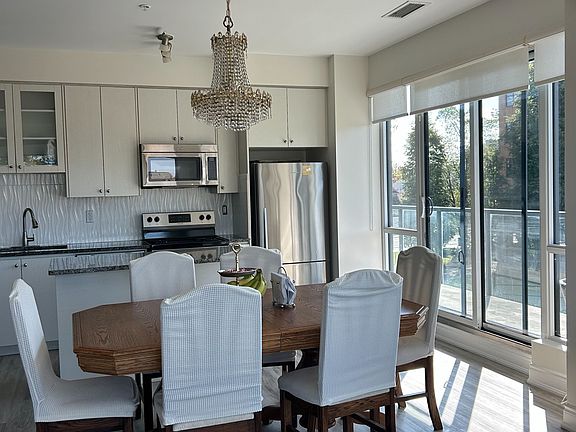 This beautifully upgraded 2-bedroom + den condo boasts a rare 454 sq ft wraparound balcony-perfect for outdoor dining, entertaining or simply enjoying the view. The sun-filled open layout features floor-to-ceiling windows with remote-control window coverings. The modern kitchen shines with granite countertops, a sleek backsplash, and stainless steel appliances. Bathrooms feature upgraded tile, and new flooring runs throughout the unit. The versatile den is ideal for a home office. The unit includes 2 parking spots and a locker for added convenience. Enjoy top-tier amenities including an indoor pool and party room. Located steps away from transit, shopping, and dining.