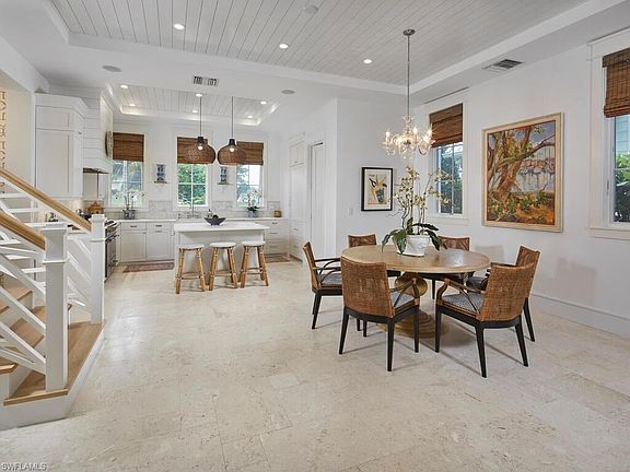 In the heart of Olde Naples, this refined residence marries timeless architecture with resort-caliber ease. An elegant foyer opens to sunlit living and dining spaces finished in shell-stone travertine, flowing to a chef’s kitchen with custom cabinetry, luxury appliances, premium finishes, and a wet bar made for effortless hosting. A family room spans the courtyard, blurring indoors and out. Upstairs, a serene primary suite and two gracious guest suites—each with lofty ceilings and tailored millwork—are joined by a flexible den/office, a second wet bar and a well-placed laundry. Beyond, a walled courtyard becomes a private sanctuary with plunge pool, generous spa, outdoor kitchen, espalier greenery, outdoor speakers, and ample patio for dining under the Florida sky. Thoughtful comforts include an elevator, smart-home features, security system, and a spacious two-car garage with storage. Moments from Naples Bay, pristine beaches, and the boutiques and dining of downtown, this home offers the polished ease of luxury resort living—beautifully edited and impeccably executed.