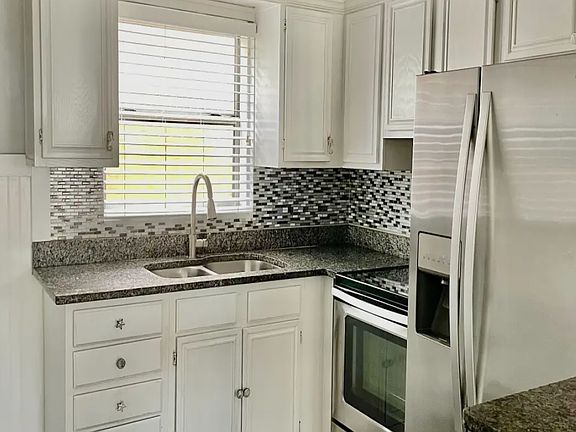 - Fully Equipped and Updated Kitchen: Whip up delicious meals with ease in the newer stainless steel appliances and white shaker cabinets. Includes a refrigerator, stove, and an over-the-stove microwave. Granite countertops.