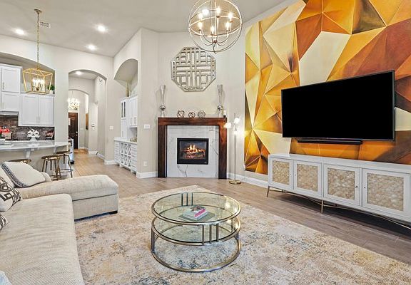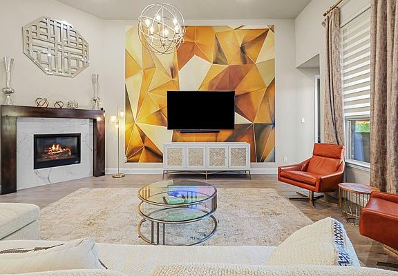 Cozy fireplaceModern finishesOpen floor planOutdoor kitchenStainless steel appliancesCustom built-in shelvingSpa-like en suite bathroom