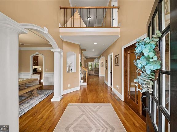 Located in one of Canton's most sought-after communities, Harmony on the Lakes, this stunning 6-bedroom, 5-bath home offers the perfect blend of elegance, comfort, and resort-style living. Built in 2006 on a peaceful 0.36-acre cul-de-sac lot, this home is surrounded by scenic nature trails, lake views, and an abundance of neighborhood amenities. From the moment you step into the grand two-story foyer, you'll be greeted by custom column archways and beautiful finishes that set the tone for the entire home. Just off the entry, French doors lead to a private office with bamboo flooring and a closet-perfect for a work-from-home setup or easily converted into a sixth bedroom with convenient access to a full bath. The formal dining room is ideal for hosting dinner parties, while the family room impresses with a coffered ceiling, a striking floor-to-ceiling stone gas fireplace, built-in cabinetry, and custom window treatments. The gourmet kitchen is a chef's dream, featuring granite countertops, stainless steel appliances, a double oven, a central vacuum system, and a sink with a serene view overlooking the backyard. The kitchen flows seamlessly into the keeping Room, enhanced by custom window valances and beadboard wainscoting, and opens to a private screened porch with slate flooring-perfect for relaxing or entertaining. Upstairs, the massive owners suite is a luxurious retreat with a tray ceiling and cozy sitting nook. The spa-like ensuite bathroom boasts a walk-in glass shower, a jetted soaking tub, dual granite vanities, framed mirrors, and custom lighting. The 12x14 custom walk-in closet with built-in shelving is a dream come true! Additional bedrooms include private or adjoining baths, offering comfortable accommodations for family, teens, or guests. The fully finished terrace level is designed for fun and entertainment. It features a media room with a 15-foot custom wood entertainment center, surround sound, wet bar, and fridge, plus a gaming area with marble and travertine tile, a playroom/bedroom or home office with floor-to-ceiling built-ins. Step outside to the terrace-level patio, ideal for a hot tub or simply unwinding after a long day. Harmony on the lakes offers swimming pools, clubhouse, tennis courts, lakes, docks, fishing, walking trails and so much more! This home is incredible and awaits its new owners!