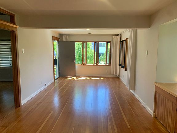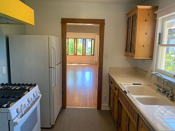 A beautifully restored and updated 1920 home. Built-in custom cabinetry. Two bedrooms with new window coverings. *New HVAC heat-pump, ducted system controlled by a programable thermostat. The front yard is planted in a variety of native and mostly drought tolerant species. There is also a sitting deck in the front yard. A large and welcoming front porch. Two parking spaces in the driveway. The original Douglas Fir flooring has been restored. The kitchen features custom cabinetry, gas range, exhaust hood, refrigerator and under-sink water filter with a sink deck mounted faucet. A washer and dryer are provided in a back room off of the kitchen. The laundry appliances are not warrantied. The bathroom features a ceiling raised to the roof level with an operable skylight. The plumbing fixtures are of high quality and include a pedestal sink. There is a separate shower as well as an original type claw-foot bath tub. There are many custom made windows in the living room. To the south side of the dining room is a large bank of drawers and cabinets situated under a bay window. Above the cabinets is a platform suitable for use as a day-bed. Lighting is provided throughout the house by recessed ceiling fixtures with high quality LED bulbs controlled by non-buzz or flicker dimmers. In the backyard there are two seating areas for the house and a large bike storage shed. The house is offered strictly on a NO PETS and NO SMOKING basis. The owner lives in the rear house and attends to gardening and repairs.