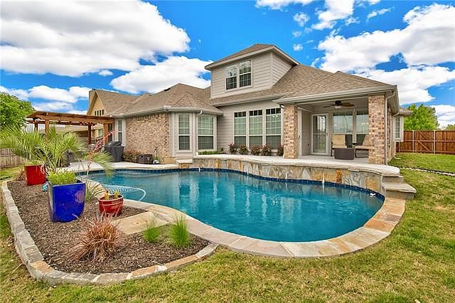 Beautiful custom home with a backyard oasis including infinity swimming pool. This home boasts an open floor plan with 3 large bedrooms, 3 full baths, an office that could be used as a 4th bedroom, a media room and a formal dining room. The large master suite has extended sitting area with an en-suite bathroom featuring a jetted tub, separate shower and a large walk in closet. Kitchen upgrades include stainless appliances, upgraded solid surface counter tops and lots of cabinet space. Cool off from the Texas heat in your backyard oasis where the recently installed pool has a high efficiency pump system, waterfalls, beautiful landscaping and a pergola. Amazing greenbelt view with gated access.