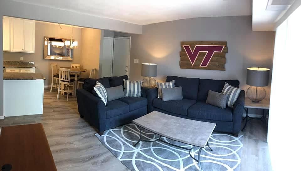 Fully Furnished and only 1/2 mile from campus (walking/biking distance) + VA Tech (BT) bus stop 1 block away. It's a second level, two bedroom, one bath unit completely gutted and remodeled in 2020. It comes fully furnished including living room, dining, and bedrooms (bed, dresser, side table for each room). The remodeling included new flooring throughout, all new kitchen with granite counters, lots of cabinets, new appliances (including washer/dryer combo, dishwasher, stove, refrigerator, over range microwave) and new bathroom upgrades. Cost is $1,575 per month (includes water/sewer, trash, property maintenance, snow removal) PLUS dedicated parking lot in front of the building with plenty of spaces. You can add electric to rent ($125/month and we take care of the account so you don't have to). Lease would run August 3, 2025 to July 28, 2026 (12 months). The security deposit is $1500 and first month's rent is due by June 1, 2025. Only 1/2 mile from campus (walking distance)! Fully furnished. 12 month shared lease. No pets. No smoking. Dedicated parking lot.