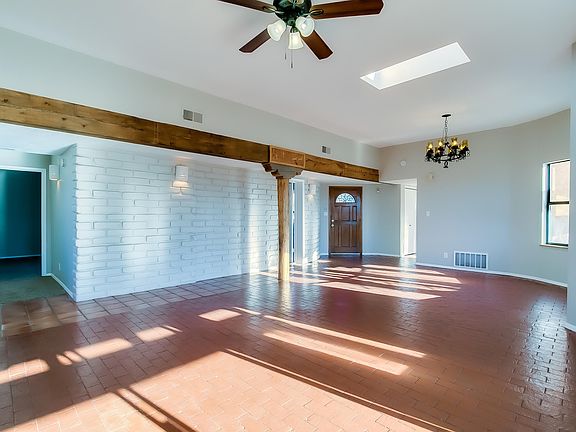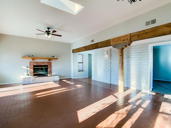 Fabulous single story custom pueblo style home situated on a large .94 Acre lot w/mountain views! Tons of natural light throughout! Seller owned photovoltaic solar panels for low energy cost. Brick floors in main living area w/exposed adobe wall accents, SW wood beams, Viga, corbels & raised ceiling. New two tone accent paint, carpet in 2nd & 3rd bedroom, tile floors in primary bathroom & hall bathroom & some plumbing fixtures. Kitchen features updated SS appliances w/gas range, vent hood & DW, breakfast bar & nook. Second living area perfect for home office/flex space. Separate second primary/in-law suite bedroom w/setting area, 3/4 bathroom & back patio access. Spacious primary bedroom w/full bathroom, separate tub & shower, dbl sinks. Oversized 585 Sq. Ft. Detached 3 car garage.