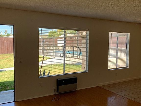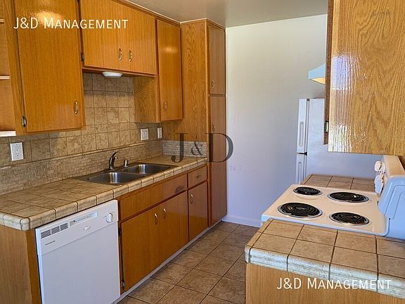 This unit features laminate flooring in the large living area and ceramic tile in the dining room, kitchen, and bathroom. Custom vinyl window coverings are installed throughout. The modern kitchen includes all-white appliances: a stove-oven, refrigerator, and dishwasher. The unit also has A/C, abundant natural light, spacious cabinets, and custom ceramic tile countertops.The spacious, carpeted bedrooms have generous closets and access to a private, fenced patio.