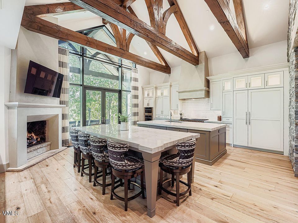 A private guest wing offers three ensuite bedrooms for comfort and privacy. The lower level features a custom 3,000-bottle wine cellar, mudroom, gym, and flexible space for a golf simulator, gear, or toy storage, with access to an oversized five-car garage designed for eight or more vehicles and equipped for car lifts—perfect for an active, outdoor lifestyle. Six gas fireplaces throughout add warmth and ambiance.