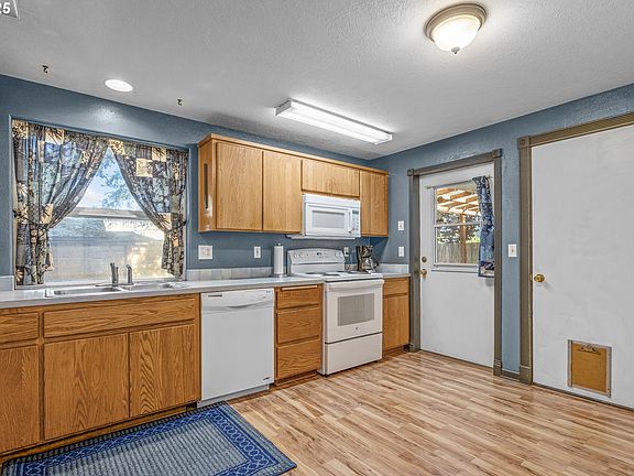 Affordable farmhouse charmer on dead-end with extra vehicle/RV parking + two-car garage and a shady, fenced back yard perfect for dogs and kids. Easy-care wood laminate floors on the main level, spacious bedrooms with double closets, one with carpet and the other with wood laminate. Kitchen/dining includes new range/oven, built-in microwave, refrigerators and built-in dishwasher. Outside, raised garden beds (strawberries!) and covered deck for all-season barbecuing. Full 2-car garage includes workbenches, storage cabinets and washer and dryer (included in sale). Move-in ready!