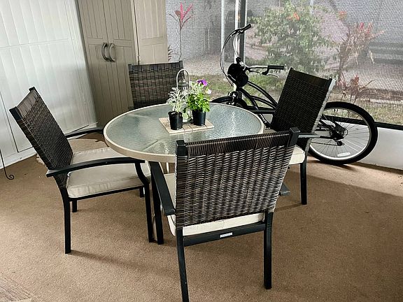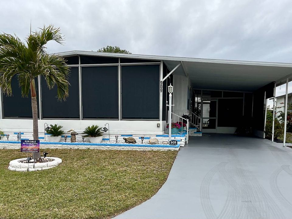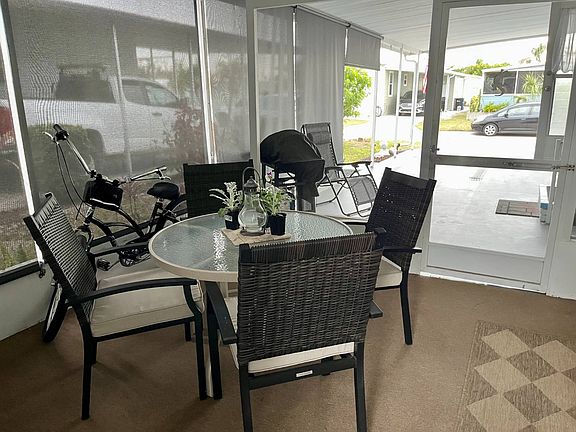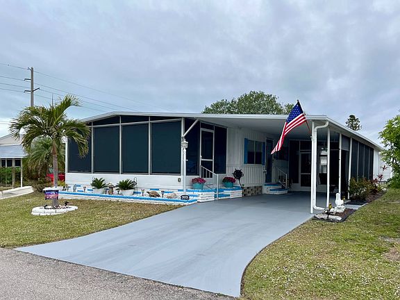 Charming 2-Bed, 2-Bath Home with Extensive Upgrades - 909 Montego W Step into paradise with this beautifully updated home featuring impressive curb appeal and a range of modern amenities. Located in a tranquil community of Bay Indies 55+ Resort Community, this home is perfect for those seeking comfort, convenience, and style. Exterior highlights are a self-cleaning Palm and vibrant potted flowers at the entrance, painted cement carport and outdoor screen room flooring, shade screens extending from the screen room to the covered carport for added privacy and sun protection, a cozy sitting area at the back, plus BBQ for outdoor cooking. An extra craftsman shed conveniently located in the screen room and a spacious shed with W/D and extra storage for those golf clubs, bikes or beach toys. The interior has many updates to include, a new kitchen with granite countertops, new cabinets, modern appliances (including a convection oven), a refrigerator less than a year old, and updated lighting. Plenty of cabinetspace and extended counter to sit with morning coffee. The open dining area has seating for six, portable server, privacy blinds and additional storage under the counter plus a closet perfect for a liquor cabinet or small appliances. The very tasteful nautical-themed home with subtle blue shades flows throughout with the living space including two chairs, sofa, a large cabinet with desk inset, rug and stylish vinyl plank flooring throughout. The two bedrooms have an abundance of space with the master accommodating a king-sized bed and room for plenty of furnishings, includes a walk-in closet and boasts an ensuite bath with newer shower stall with built in seats, updated vanity, double linen closet and durable tile floor. The large guest bedroom fits twin beds, has a double closet, wall-mounted TV, and ample space for furniture. The guest bath also is updated with a tub/shower, shelves and large vanity. Both baths are equipped with modern fixtures. The beautiful lanai off the living room has new screening with custom shades for a cozy retreat and some furnishings remaining. Additional perks the owners have completed are; roof coated in 2024, and a Nest heating system for energy efficiency, updated electrical box, new Bahama shutters and shirting and freshly painted. This 41'x24' home is partially furnished, allowing you to move in and decorate your way and start enjoying your new lifestyle in paradise. Whether you're drawn to the tastefully designed decor or the inviting outdoor spaces, this home is a must-see! Imagine living in one of the most desirable 55+ Communities on the Gulf Coast. Take full advantage of the gorgeous location in the Venice area. Take a dip in one of the three pools, attend a concert or a scheduled dinner, play a game of tennis or pickleball, join one of the 40 clubs and play numerous card and trivia games. There are plenty of ways to fine tune and enjoy your active lifestyle or relax in the library. Bay Indies is ideally located just minutes to golf, fishing, beaches, dining, and boasts being accessible to three airports, the legacy trail, wildlife rookery and state parks. There is boat and RV storage right down the street. A casino in Tampa and the Tiger Woods Pop Stroke 2 course putting greens in Sarasota are a must. This home is offered unfurnished giving a blank canvas to personalize your way. This spectacular home is Florida living at its finest. All listing information given to us is considered appropriate and reliable but should be independently verified through personal inspection by appropriate professionals. Home must be maintained to the Community Prospectus. The lot rent is determined by the Community office and covers all amenities offered including property taxes and lawn maintenance.