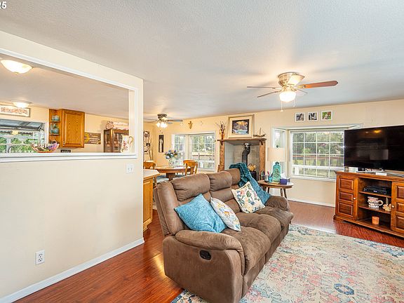 Welcome to this versatile and farm-ready property featuring a spacious one-level home with thoughtful updates and plenty of extras. Inside, you’ll find an open floor plan with a large kitchen, new LVP flooring, a wood-burning fireplace, and zoned heating with wall units and baseboard heat. The primary suite offers a generous walk-in closet, private deck access, and a large bath with tile shower. The second bath features a tile surround tub, and the laundry room includes a sink and business cubby for added convenience. Step outside to enjoy a wraparound deck with fresh paint, producing apple and peach trees, a compost pile, fully fenced property and cross fenced areas ideal for chickens, goats, or gardening. Outbuildings include a 10x20 structure and a chicken run. The detached oversized garage and attic fan provide extra functionality.
