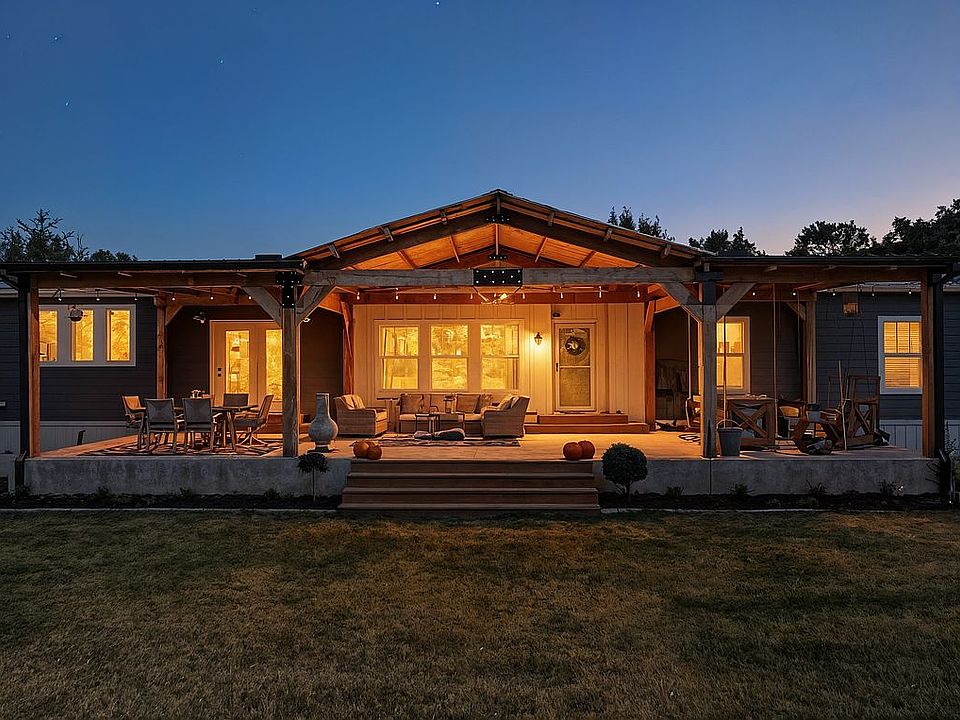 Custom timber framed porchLarge open floor planWood burning fireplaceBetter insulationStructural strength