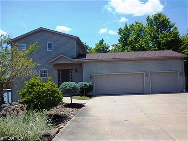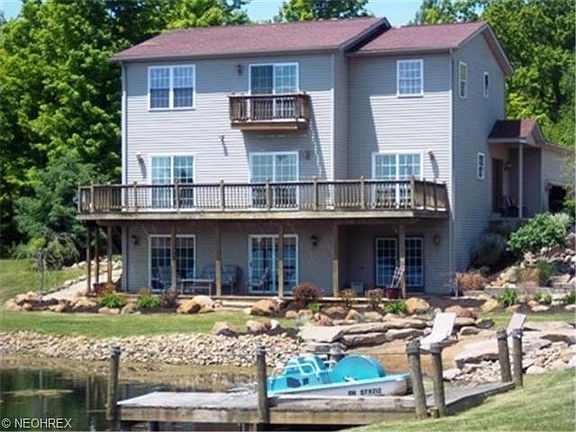 This remarkable beach home overlooks a quarry lake and provides a tranquil setting for those relaxing days and nights. This fabulous home features 3 bedrooms, first floor office with double glass doors, kitchen with stainless steel appliances, pantry, maple cabinets, ceramic floors, breakfast bar and sliders to a deck overlooking the lake.The Great room offers modern colors, ceramic floors, gas fireplace and sliders to a deck overlooking the lake. The second floor features a spacious loft, master suite with master bath offering jetted tub, shower, water closet, double sinks, closet and slider to a small deck overlooking the lake. The second bedroom offers a large closet and modern colors.The lower level features a bedroom with a huge closet, spacious family room and additional rooms for storage.There is a 3 car attached garage plus a large pole building. There is a cabin in the woods that features ceramic floors and cedar walls and overlooks the Cuyahoga River. All this on 13.9 acres. Home Warranty provided for the buyer.