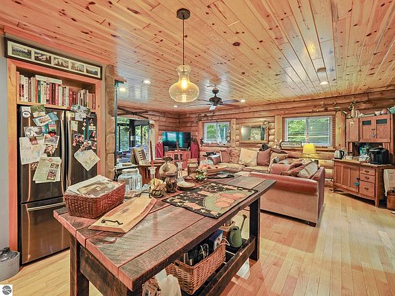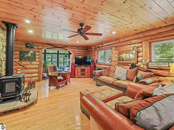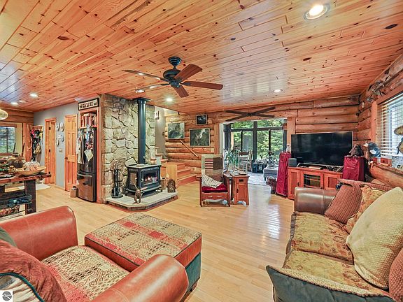 Tucked away from the hustle and bustle, this true red pine log home offers the perfect sanctuary for anyone seeking tranquility and adventure in equal measure. This timeless home is situated on nearly 6 acres with a groomed walking trail on the property. In 2024, the exterior of this full log home was completely restored, featuring fresh stain and chinking. The interior logs now have fresh sealant and protection, making the space shine alongside the knotty pine ceilings, hardwood floors, soapstone wood fireplace, and a 3-season room with peace filled views of nature. The 30x40 pole barn stores your recreational gear, keeps your vehicles out of the elements, provides a workshop and best of all there is an attached lean-to with RV electric, water and sewer hookup. Across the street is the Kalkaska ORV trail and state land with many public lake accesses including Starvation Lake nearby. This one-of-a-kind property is a rare gem, blending rustic charm, modern conveniences, and the assurance of a home that has been maintained.
