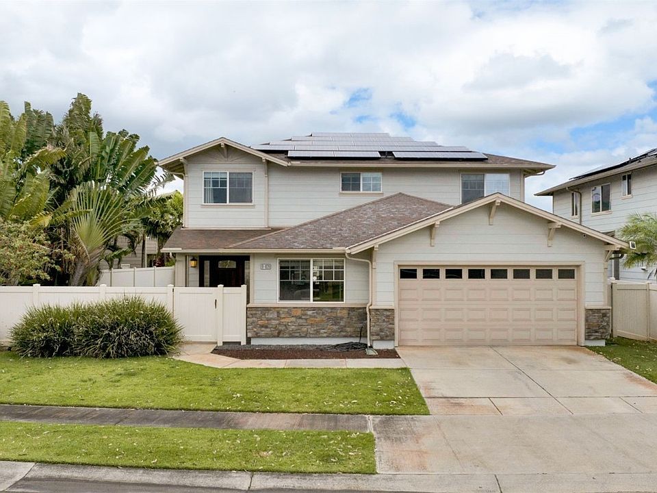 Rarely available Aspen Model featuring a large bedroom and full bathroom downstairs, an open layout, a spacious laundry room with lots of storage, a family room, a formal living/ dining area and a a cooks kitchen with tons of cabinet space and all the appliances.. The second level offers an upstairs library/ office area, large guest bedrooms, a spacious primary bedroom with vaulted ceiling, plantation shutters, en-suite bath with garden oval soaking tub, separate shower, and walk-in closet. This residence also offers a newer dual zoned AC system, 27 Fully owned PV panels, a back up battery, solar water heater, extra fridge and a chest freezer. The landscaped and fully enclosed enormous yard with covered lanai is great for pets, relaxing, or entertaining family and friends. This highly desirable development has the lowest HOA fee of all managed communities in Ewa Beach. Conveniently located to Ewa Gentry Community Center (pool, rec center, playground, & dog parks), schools, walking/ jogging paths, shops, restaurants, entertainment, golf courses, beautiful beaches, and bus lines.
