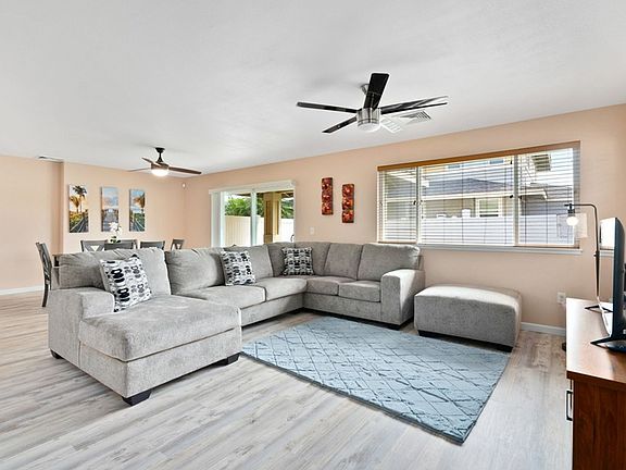 Slide open the patio doors and let tradewinds mingle with central A/C as you sink into the oversized sectional. Vinyl plank floors, neutral hues, and ceiling fans create breezy comfort, while a smart TV is ready for movie nights. The adjacent dining table seats six for take-out poke or home-cooked feasts.