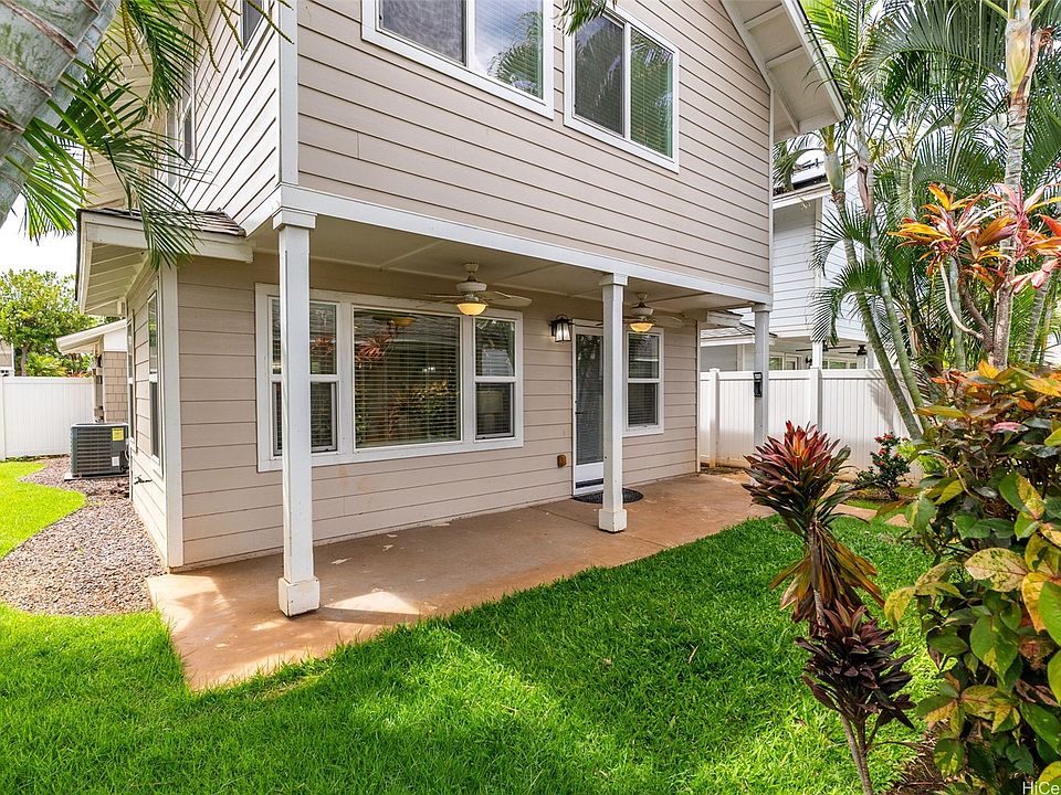 PICTURE THIS: Waking up in your spacious primary bedroom, sunlight filtering through the windows as the gentle trade winds carry the sound of ocean waves and the distant thwack of golf balls from the championship Ernie Els golf course. Picture yourself entertaining in your private, landscaped backyard or unwinding inside where cool AC and porcelain tile floors maintain a cool atmosphere. Your 14 solar panels and battery storage working in the background, keeping electric bills low. Also, the ideal layout offers a full bedroom and bathroom on the main level-ideal for guests, flexible living, or enjoying single-story convenience. Security system ready for you to rest easy. Located in the desirable Kuapapa at Hoakalei community, everything you need is at your fingertips—championship golf next door, plus your association fees include HD cable, high-speed internet, neighborhood pool access, and the stunning Wai Kai Hale Lagoon for water activities and relaxation. Pristine beaches, shopping, and dining within reach- it’s no longer vacation, it’s home.