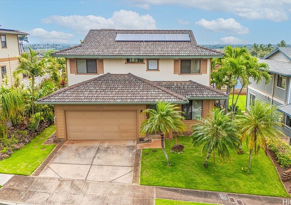 Welcome to Kapolei Knolls, where island living meets comfort and convenience! This rarely available 5 bedroom, 3 bath home offers over 2,300 sq. ft. of thoughtfully designed living space, perfect for multigenerational living or anyone craving extra room to spread out. Featuring a full bedroom and bathroom on the first floor, this flexible floor plan accommodates guests, extended family, or a convenient home office with ease. Wake up to ocean views from three of the five bedrooms, including the spacious primary suite as well as from the living room and backyard, offering the perfect backdrop for your morning coffee or evening wind downs. Enjoy island life right in your backyard, which comes complete with dragon fruit, sour sap, papaya, and acerola fruit trees, perfect for fresh, homegrown treats year round. The original owner has lovingly maintained this home in pristine condition and it shows! Modern upgrades include 25 owned photovoltaic panels for energy efficient living and a brand new central AC system installed in 2020, keeping your home cool while keeping energy bills low. Minutes from Walmart, Kapolei Shopping Center, schools, Kapolei Golf Courses and more!