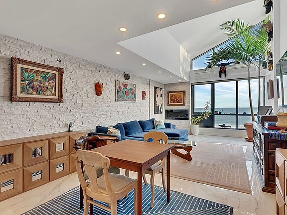 Upon entering, an elongated Italian ceramic tile hall entices you toward a breathtakingly cinematic view, with a double coat closet and in unit new full-sized GE washer and dryer discreetly and conveniently tucked away. The kitchen is replete with updated stainless steel appliances, new LG smart refrigerator and Samsung dishwasher, with original gas range and oven encased in custom Poggenpohl cabinetry and Caesar stone counters. A newly installed Brita undersink water filtration system provides filtered water throughout the residence. Ductless, split system heating and cooling offer optimum comfort to each individual room and climate zone. An open concept dining area draws you toward a vibrant and illuminated great room featuring soaring double height ceilings and egress to a private oceanfront terrace.