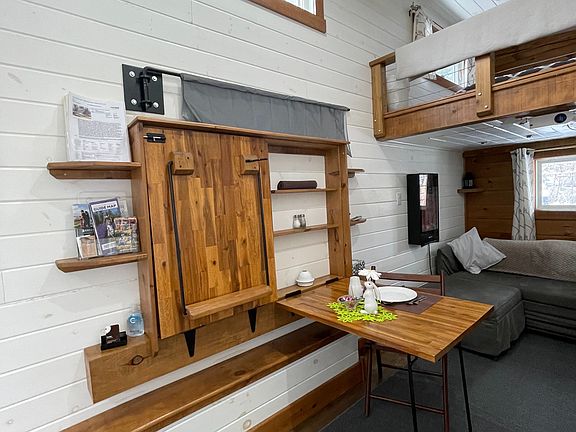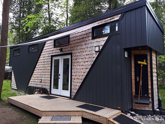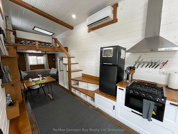 TINY HOME ONLY! IT DOES NOT COME WITH THE LAND AND NEEDS TO BE MOVED TO YOUR OWN PROPERTY! Welcome to one of today's unique options for a year-round bunkie/guest house or an amazing way to relax after a cold and wet day hunting! This adorable, custom 32-foot tiny home has been built and designed with the ultimate storage and best use in mind offering many comforts of home! Features include the capability of six guests, custom kitchen with built-in appliances, pot lights, pot drawer, pull out spice rack and double garbage containers, fridge can be propane or electric, open shelving, farmhouse double sink, walk-out French doors to deck, projector and screen in living room area, built-in tables, storage boxes in ceiling above sofa, storage shelves under stairs to main bedroom loft, 3PC bathroom with large rain head shower, electric toilet, an electric fireplace, a ductless mini-split, washer and dryer connections, 50 gallon water tank, and the electrical system features the future possibility to add a solar panel for off the grid living or back up power for when the hydro goes off! This home also comes with versatile furnishings. Have we peaked your interest? Are you curious? Buyer to verify with your township on allowed uses, required permits and to move the tiny home. APPROX WEIGHT ~ 19,000 LBS, TRI-AXEL TRAILER, WIDTH IS 8 FT 6 INCHES, LENGTH IS 32 FT, WIDTH IS 13 FT 6 INCHES. RECOMMEND HAVING A LICENSED AND INSURED TOWING COMPANY MOVE IT.