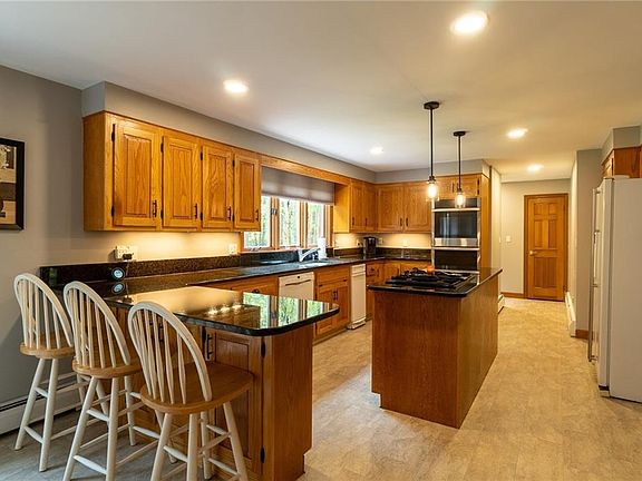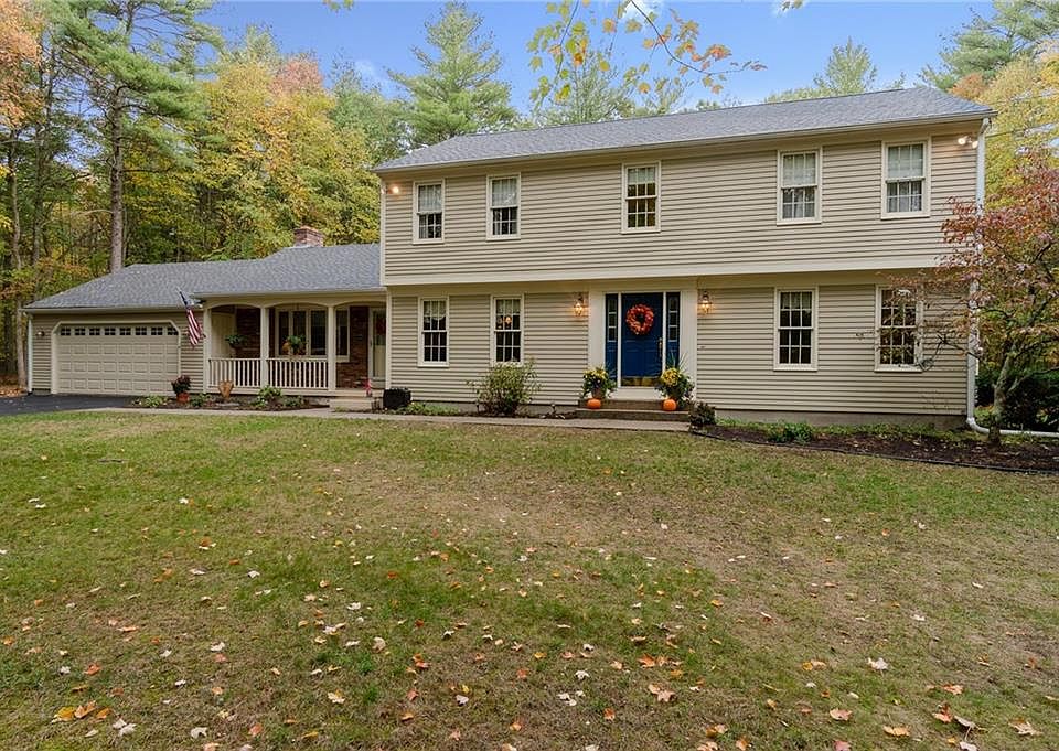 Your slice of serenity welcomes you home to 2.8 wooded acres in Hunters Ridge Neighborhood. This 4 bedroom & 2.5 bathroom Colonial offers a backyard patio with a retractable awning. An eat-in kitchen with granite countertops is open to a great room framed by wooden beams, skylights, & custom built-ins. A Laundry Room, Attached 2-car garage, & brick fireplace complete the 1st level. Well water, septic, central vac, & oil baseboard heat.