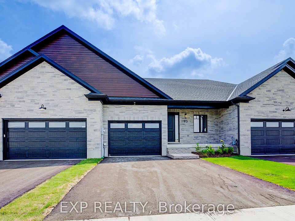 Downsize without compromise with this gorgeous end unit townhome by Duimering Homes. Tucked at the end of Bedell Drive in Drayton, this newly built bungalow pairs low maintenance living with elevated finishes. A vaulted great room ceiling amplifies light and space (hello, extra windows and 9" ceilings) and centres around a cozy electric fireplace with wood mantle. The gourmet kitchen features quartz counters, custom full height cabinetry, stainless appliances, and an island flowing into the dining and overlooking the family room. Out back enjoy a covered back patio for easy indoor/outdoor living and partial privacy fence. Two generous bedrooms include a serene primary suite with walk in closet and spa inspired ensuite. Practical perks: main floor laundry/mudroom and an attached 2 car garage with a double wide paved driveway. With only one shared wall, added privacy, and a quiet, walkable location, this is single level living without sacrificing style, comfort, or sunlight.