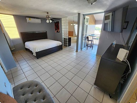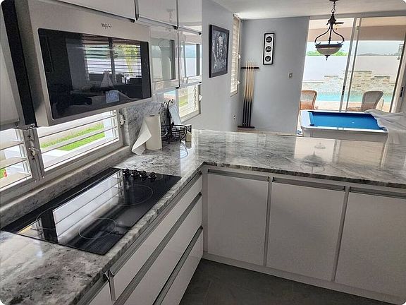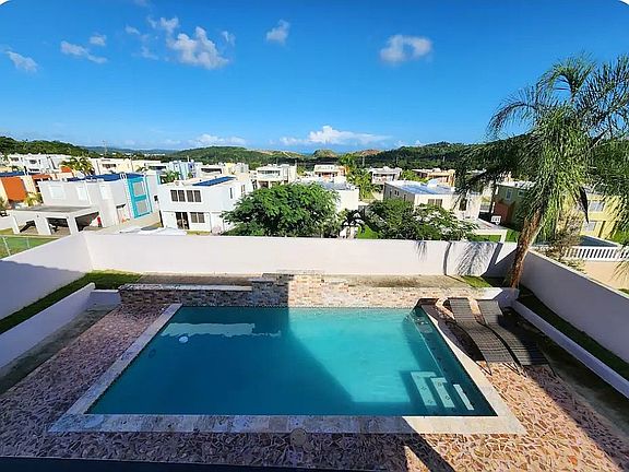 Single family home inside a beautiful gated community in Humacao. PRIVATE pool with a terrace that includes a bar, outdoor dining table and BBQ gas grill. Recently remodeled kitchen with beautiful granite. Home is in a very quiet community. Home is located in the communities best street. All the way on top of a small hill, over looking the entire community and with a partial ocean view of Vieques. Only street with no neighbors across the street. Across the street all you have is nature = a beautiul mountain backdrop is what you will have. Community is a short 5 minute drive to Palmas del Mar. Palmas has golf courses, restaurants/bars available. Naguabo's boardwalk (malecón) & "Charco el hippie" (beautiful waterdall) are both 25 minutes away. Naguabo's malecón is known for it's fresh seafood restaurants and beautiful scenery. The home is for sale "as-is" and offers will be considered. Home is also on the market for minimum 5 day rentals on airbnb and can be rented on a one year lease. Rent to own arrangements will not be considered. 3/2 Home has a enormous master bedroom with a big jacuzzi room that can easily be converted into your own private office.All three bedrooms have access to beautiful balconies.