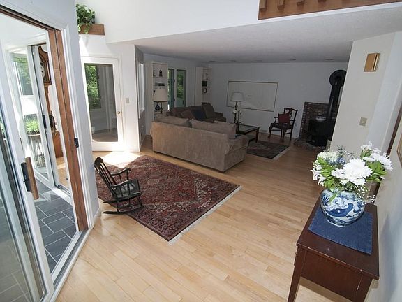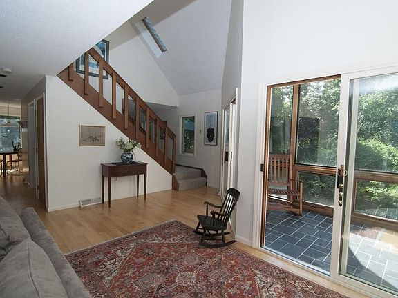 From the moment you drive down the driveway it truly feels like you are going away on vacation to your own private nature filled oasis~ It is situated on nearly 2 acres of land! This sun filled contemporary home offers spacious and open living spaces.Family room boasts soaring vaulted ceilings with access to a beautiful sunroom to sit and enjoy your coffee. Upstairs offers three bedrooms streaming with natural light, and a master with direct access to the full bathroom. Many updates include the just refinished hardwood floors on 1st floor, Updates to sections of the roof, New slider, Exterior paint in 2016, Remodeled sunroom, Deck painted, some new windows and new gutters just installed. Solar panels for hot water heating system. Basement has walls and is ready for finishing for additional living space. This home is a must see before it is gone~