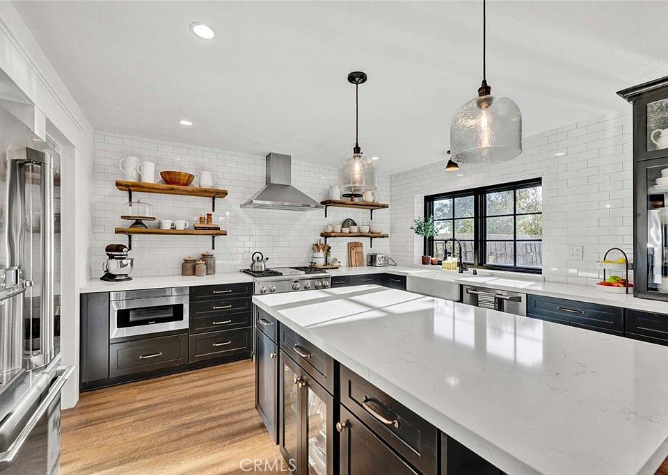 Welcome to the Most Amazing Remodeled Home in Tierra Linda! Step into a captivating Great Room with breathtaking views of the wilderness, visible right from the front door. Experience the elegance of beautiful brown laminate flooring that stretches throughout the home, paired with large windows adorned with plantation shutters, cathedral white wood slat ceilings, and a stunning candle light fixture. This room also boasts a charming built-in bookcase and dual-paned windows that flood the space with natural light. Venture into the inviting dining area, where a mesmerizing fireplace with mosaic tile and a black wood mantle awaits, illuminated by a striking light fixture. The heart of this home is the incredible kitchen, showcasing sleek black cabinets, pristine white quartz counters, a spacious island, a chic white tile backsplash, and a white porcelain farm sink. Cook to perfection on the stainless steel 6-burner stove beneath decorative wood shelving and an exhaust hood. The solid core craftsman-style door opens to a humungous pantry, ideal for all your storage needs. Step outside through the dual-paned sliding door to discover a serene and expansive yard, complete with pebble rock concrete inlay and a durable aluma wood patio cover. The easy-to-maintain Japanese grass adds a touch of tranquility, making it perfect for family gatherings, BBQs, or simply relaxing and enjoying the breathtaking sunsets. The downstairs bath features a walnut-toned cabinet with a large sink and shiplap walls, adding a touch of rustic charm. Upstairs, the primary bedroom boasts vaulted white wood slat ceilings and offers picturesque views of the Arroyo Trabuco Wilderness area. The master bath is a true retreat, with mosaic tile flooring, black cabinets topped with white quartz, dual bowl sinks, a walk-in shower with glass doors, and a spacious walk-in closet. Stroll along the catwalk to find a built-in loft desk area and a custom upstairs stackable laundry area. Two additional good-sized rooms feature laminate flooring and fresh white paint. The second bath upstairs is stylish with honeycomb white tile flooring, a grey cabinet, and grey and white quartz counters, along with a bath and shower. This home includes a two-car garage with an Official Tesla Electric Car Charger and a large attic storage space. Plus, some of the lights even work with Alexa for added convenience. Come explore this enchanting oasis—perfect for making lasting memories