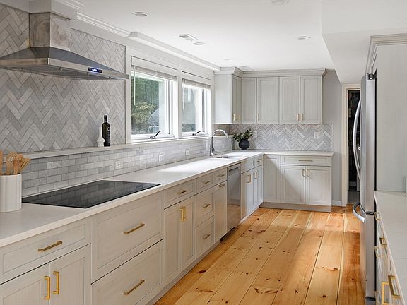 One of a kind 1950's deck house with a contemporary addition (2020). Enter into freshly painted open-concept living room with soaring ceilings and tons of natural light coming through two skylights. Chef's kitchen is a dream with a plethora of prep and storage space, an induction cooktop, double oven, quartz counters and tiled backsplash. Wide plank pine floors throughout (recently refinished on main floor and in primary bdrm). Off the living room find the primary suite, airy and bright with cathedral ceilings, a custom walk-in-closet, a luxurious spa-like en suite and a balcony. Main floor also offers another bedroom and upstairs find two more large bedrooms that give the impression of being in a treehouse with high windows. Two car garage underneath. Tiered backyard is fully fenced in with a pergola and paver patio with fire pit (2022). Hot water tank replaced in 2023. Convenient location close to W. Roxbury shops and restaurants on Centre St. and Dedham Center.