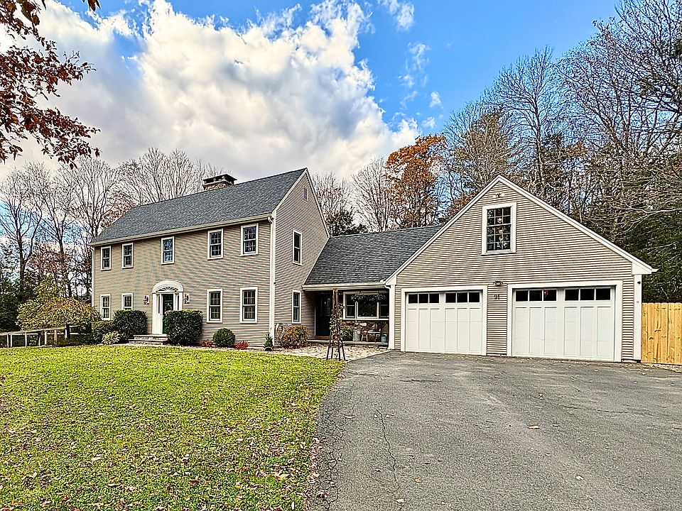 Do you dream of a simpler life - fresh air, wide open space, and the freedom to slow down? This charming New England colonial home is set on 2.5 private acres, and is tucked back from the road and bordered on three sides by non-buildable land, ensuring lasting peace and privacy. It's the perfect homestead for those who want to live sustainably - ideal for vegetable gardening, goats, chickens, or simply enjoying the quiet beauty of nature. Inside you'll find a spacious country kitchen - the heart of the home - seamlessly opening to the family room and centered around a stunning stone fireplace. Recently updated with all new appliances, including a propane gas range, and finished with beautiful granite countertops. The primary suite is a true retreat, featuring a luxurious walk-in shower, elegant marble double-sink vanity, and the comfort of heated floors. The basement has been thoughtfully designed with abundant storage shelves and a custom-built potting station with grow lights, perfect for garden lovers. The remodeled room above the garage provides flexible living space - ideal as a playroom, rec room, or home office. The updated half bath and laundry room adds charm with its warm rustic farmhouse style, blending functionality with character. Adventure is never far away, with nearby opportunities for fishing, biking, kayaking, and skiing. Whether you're seeking an outdoor lifestyle or a serene retreat, this home is ready to welcome you! Exterior video surveillance.
